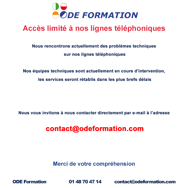 ODE Formation décline toute responsabilité en cas de perte, vol ou détérioration des objets personnels de toute nature déposés par les stagiaires dans les locaux de formation.